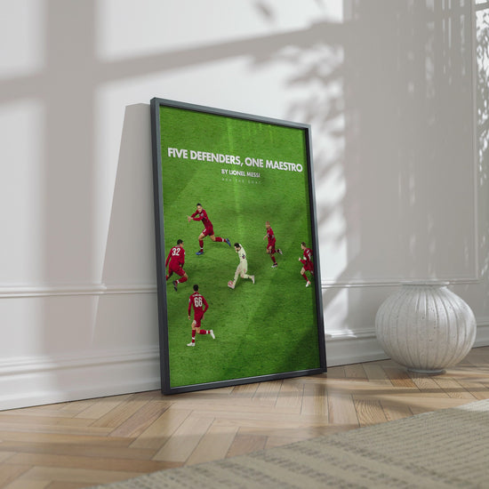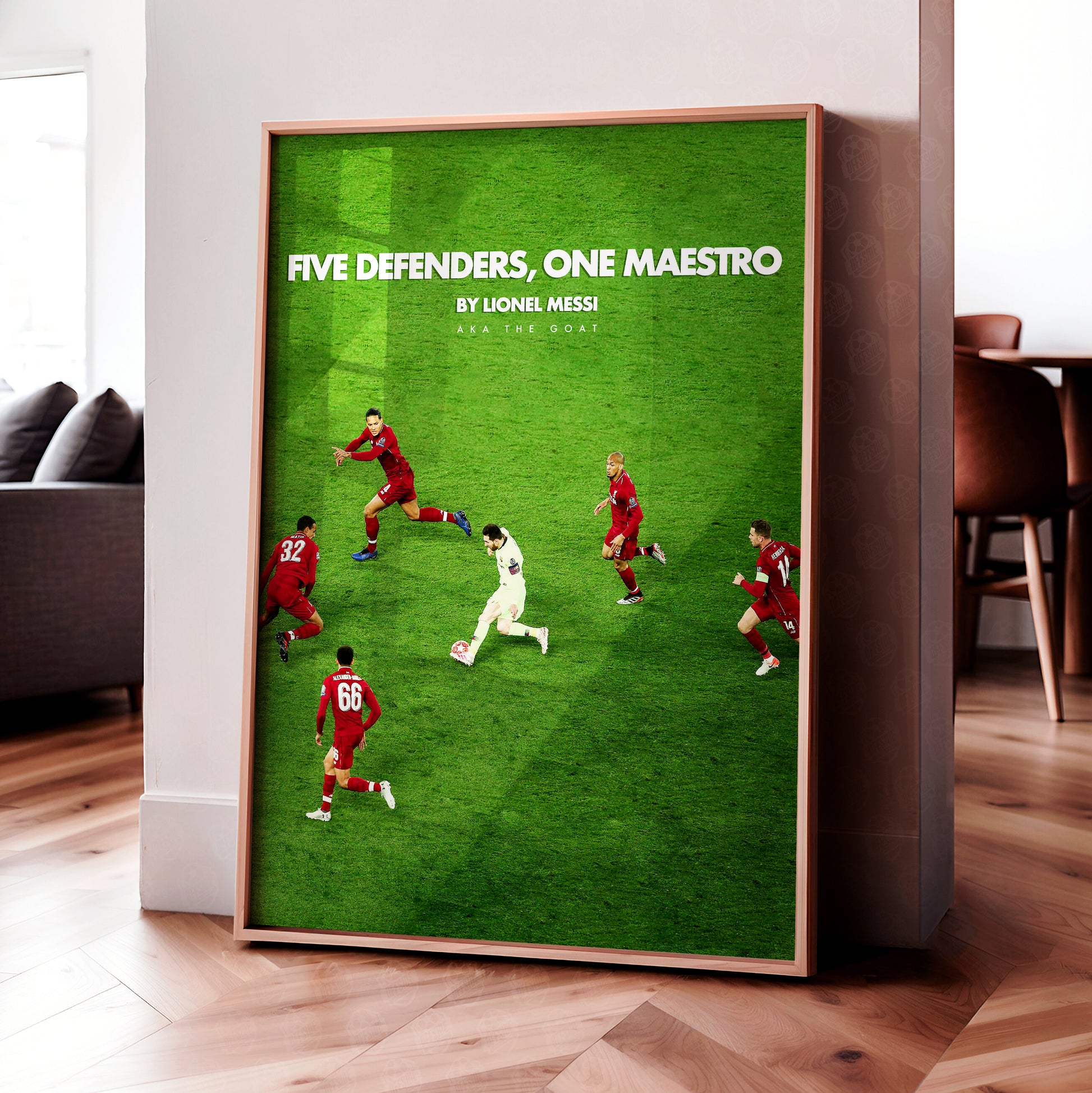 Enhance your space with this premium poster of Barcelona legend Lionel Messi '5 Defenders, 1 Maestro'.