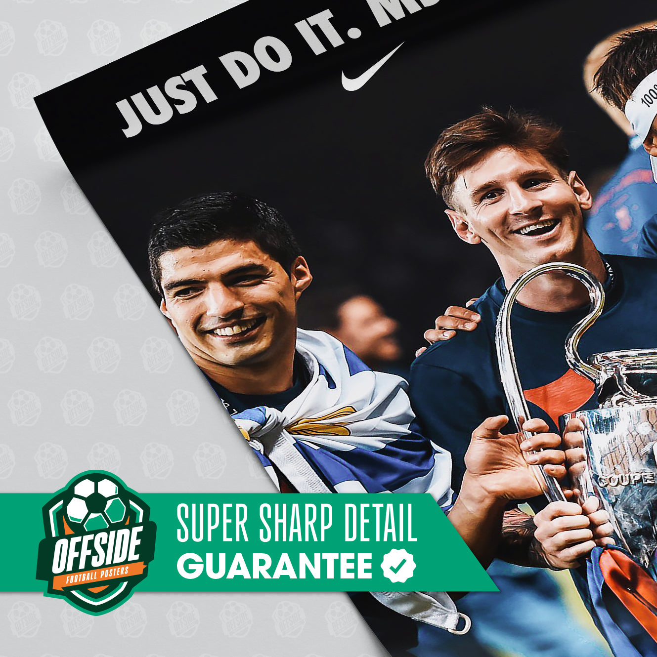 Enhance your space with this premium poster of Barcelona legends Suarez, Messi & Neymar celebrating with the Champions League trophy.