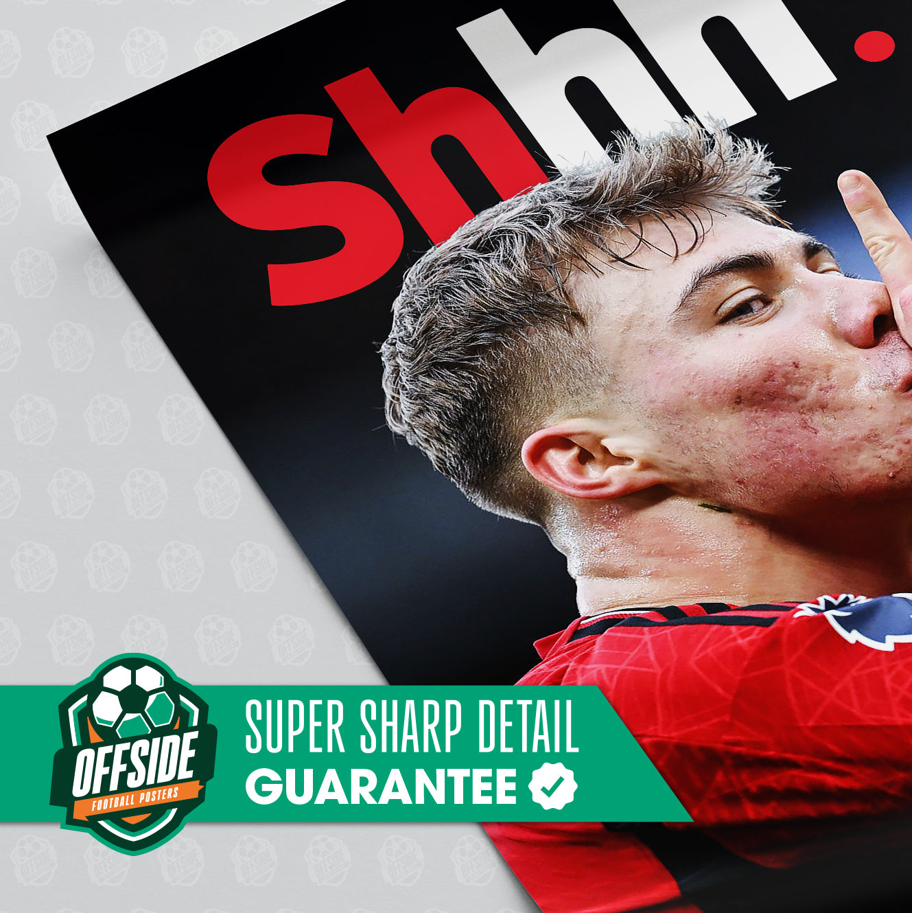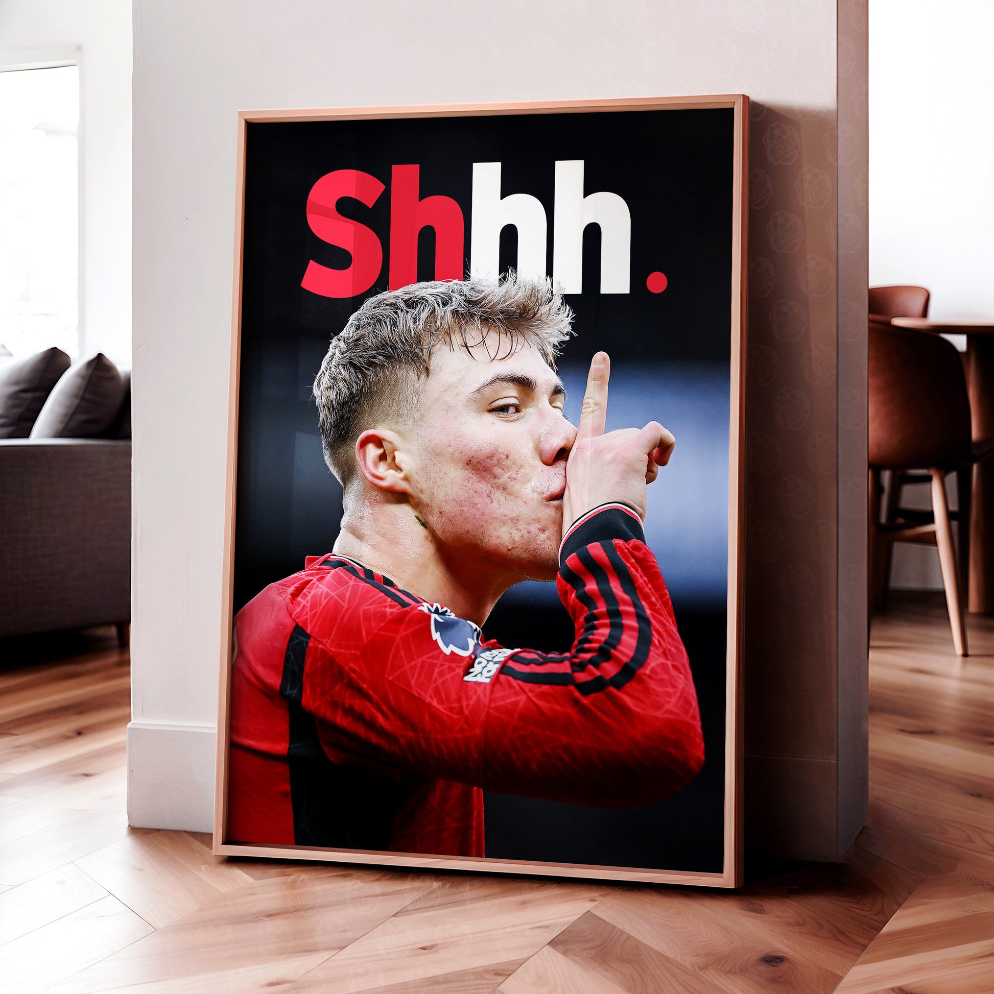 Enhance your space with this premium poster of Manchester United striker Rasmus Hojlund 'Shhh.'.
