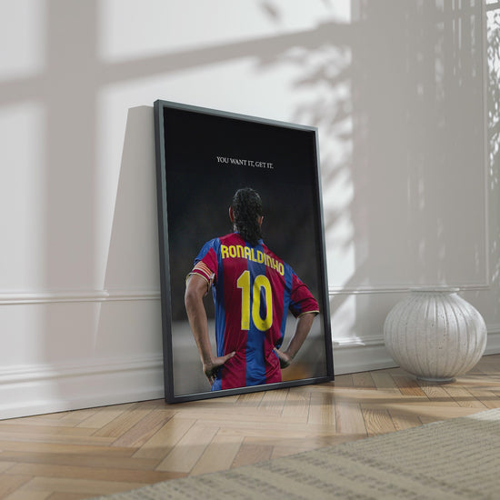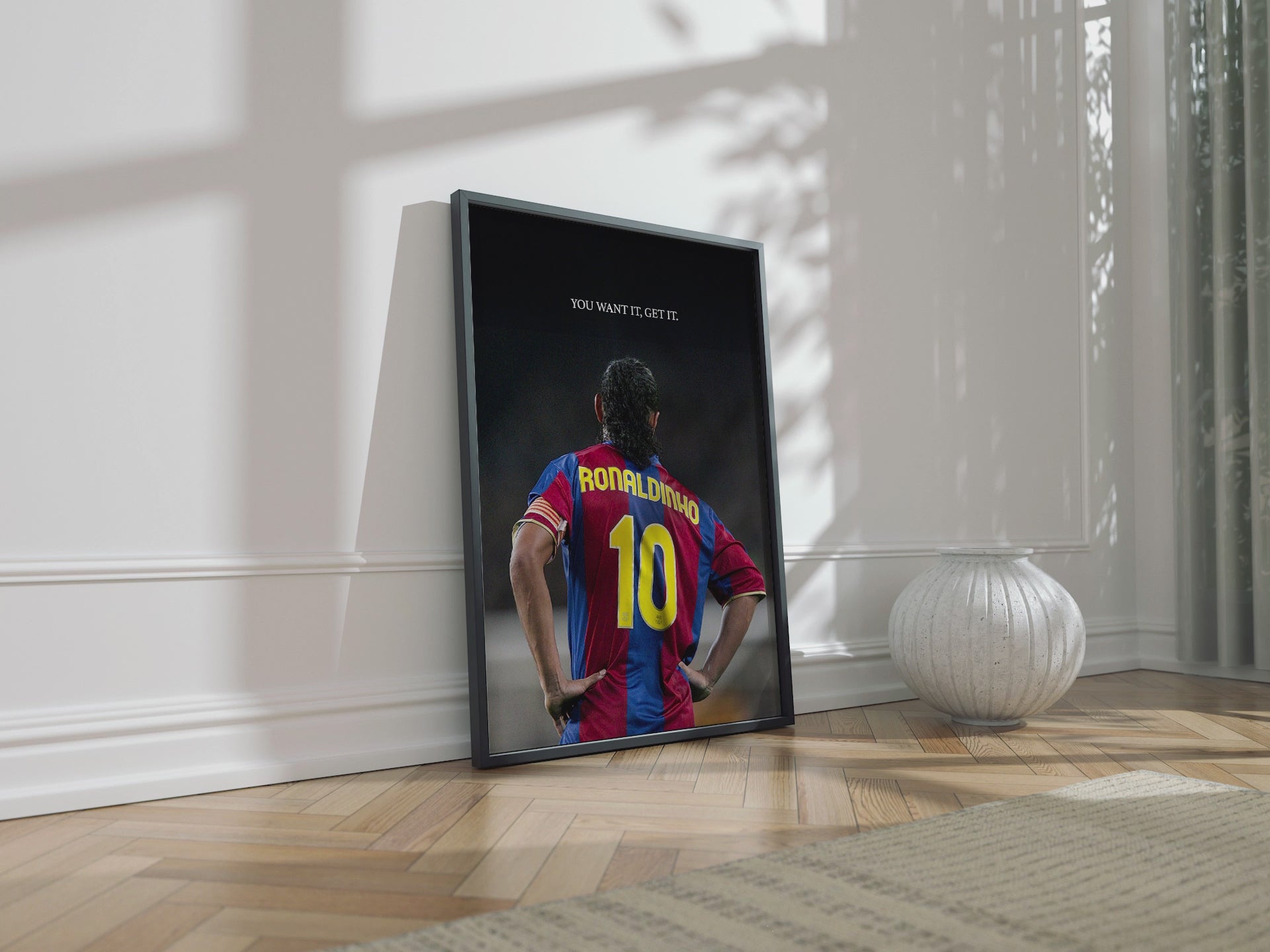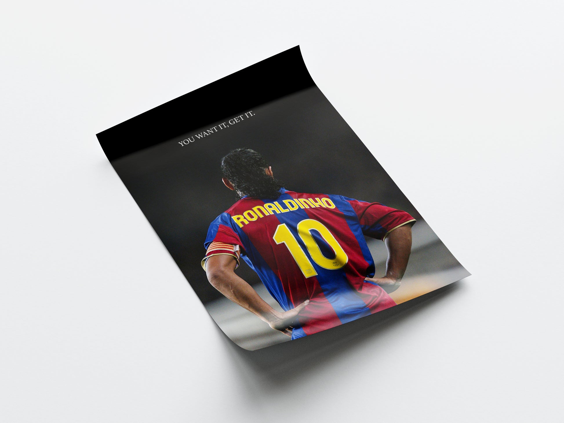 Enhance your space with this premium poster of Barcelona legend Ronaldinho 'You Want It, Get It'.